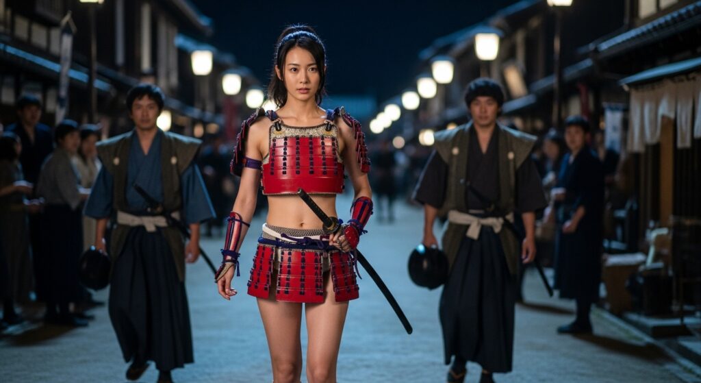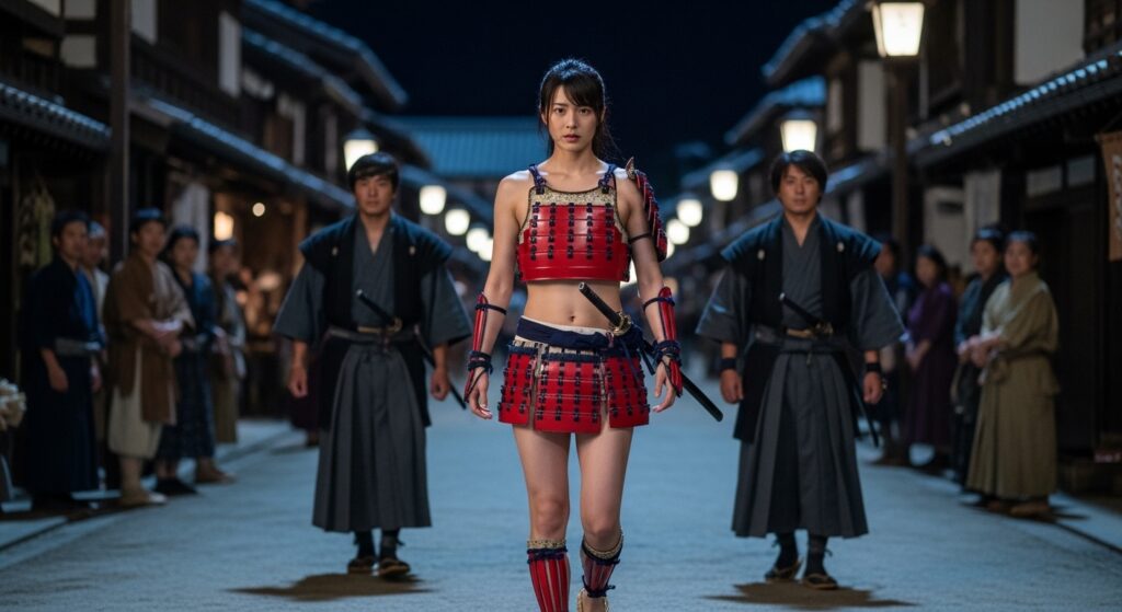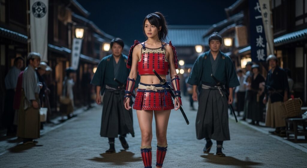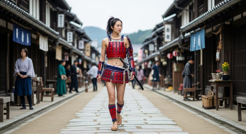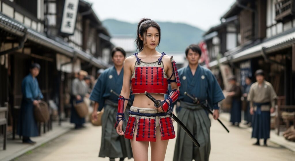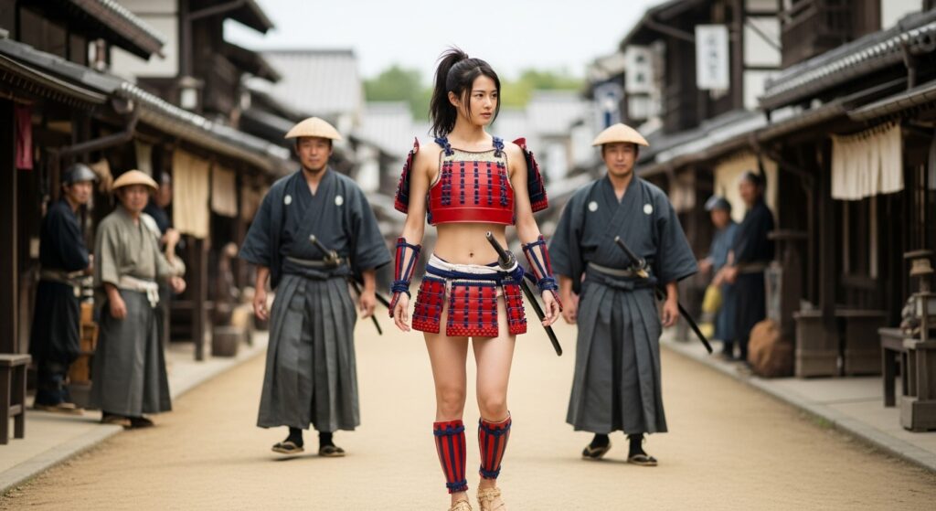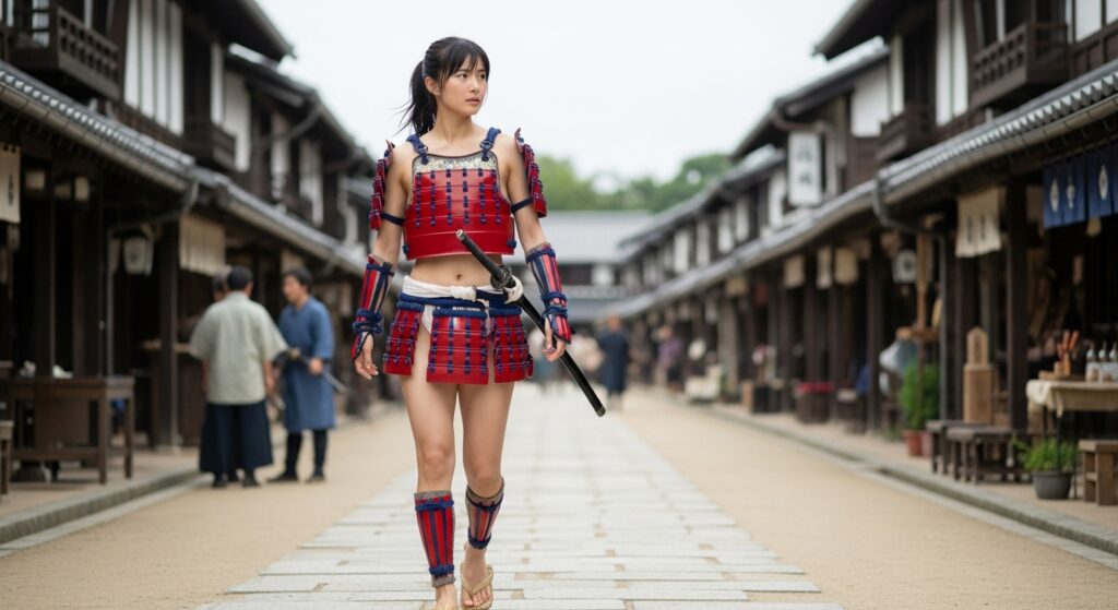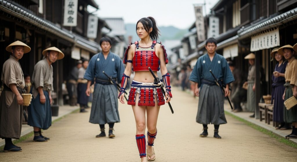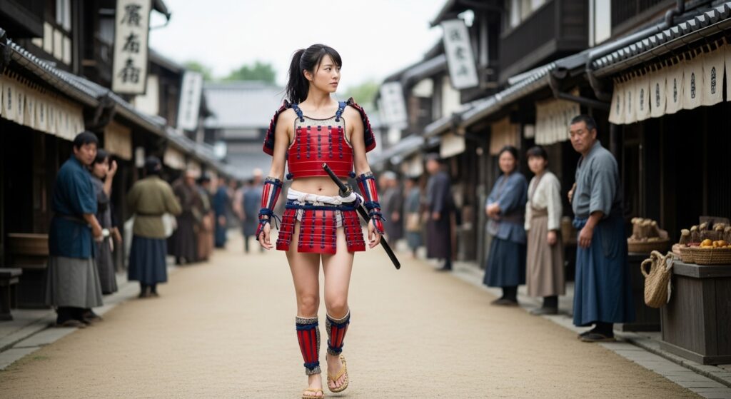 更に上で書いている「城下町を視察する姫武者」というシチュエーションの画像も作ってみたので、いくつか追加しておきます。