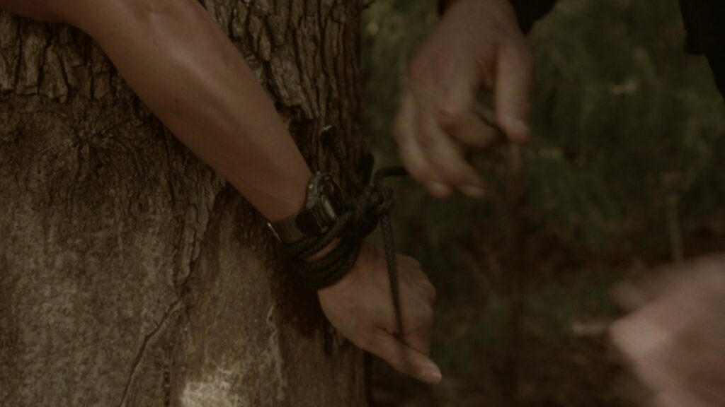 木に後ろ手に縛られるマギー