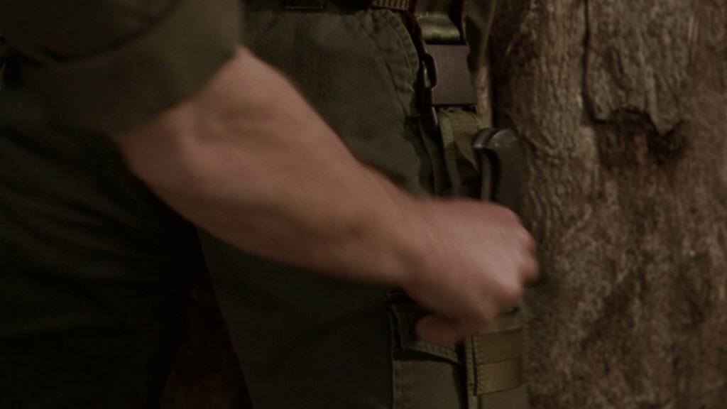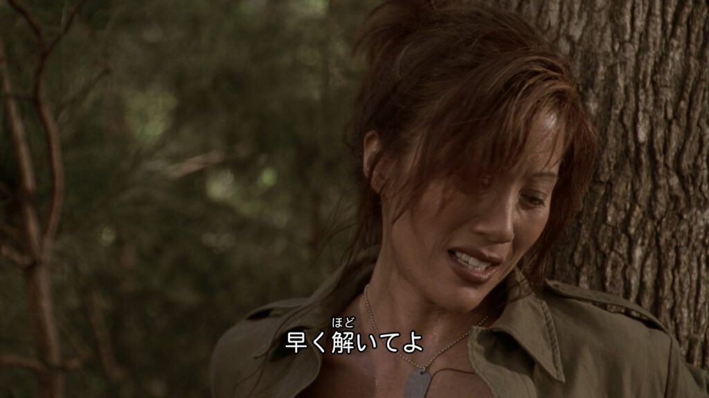 リュックはマギー自身のナイフを使って拘束を切ろうとするが、そこに撃たれたはずの隊長が無傷で現れる。結局拘束を解いてもらえないマギーがエッチくてGoodです。