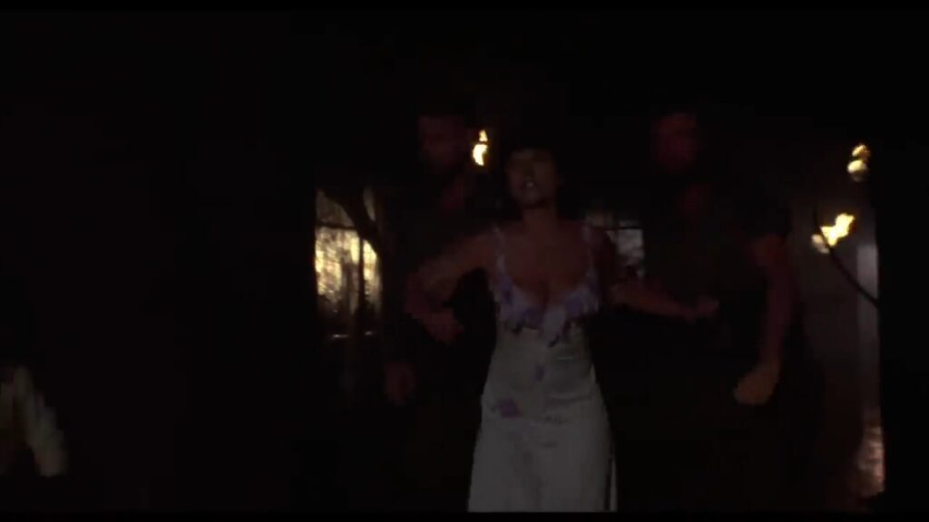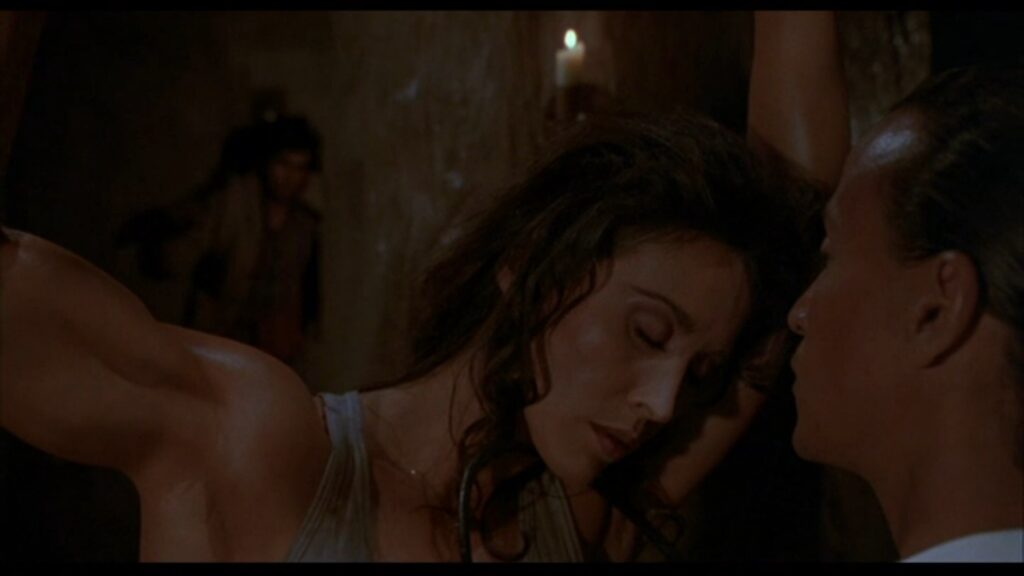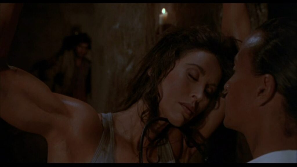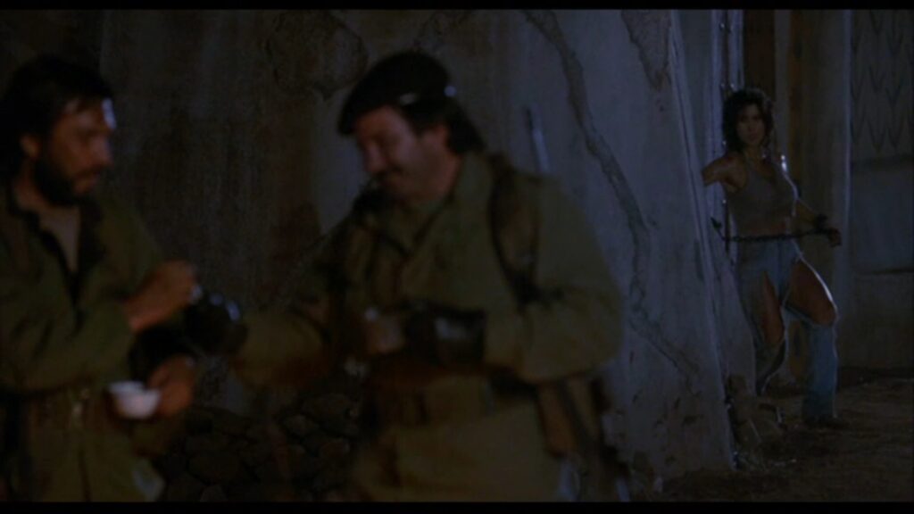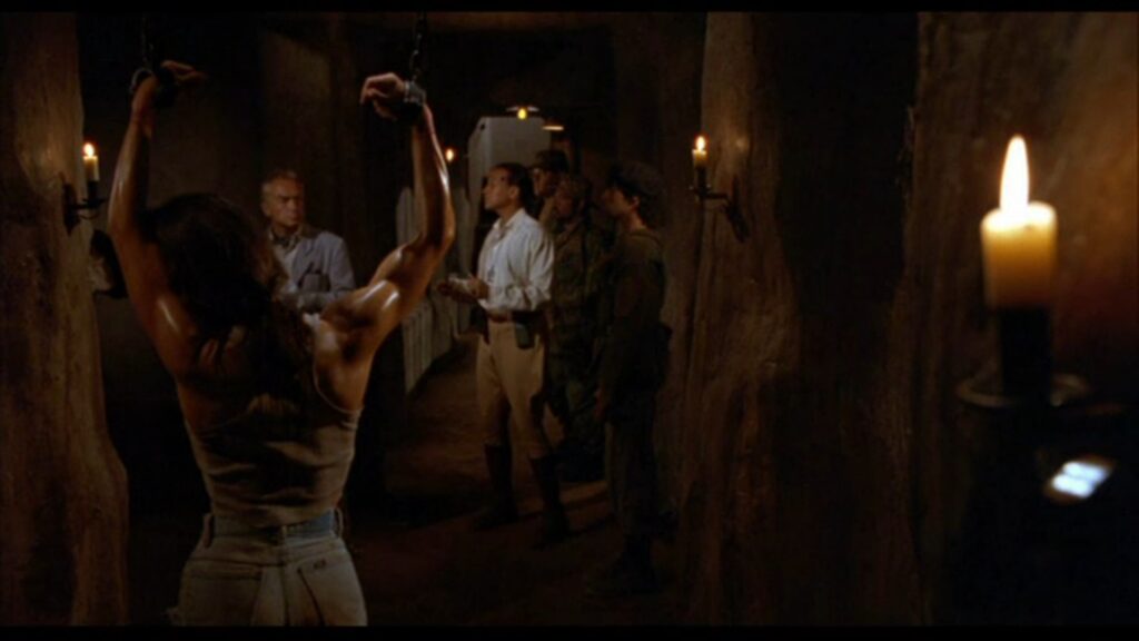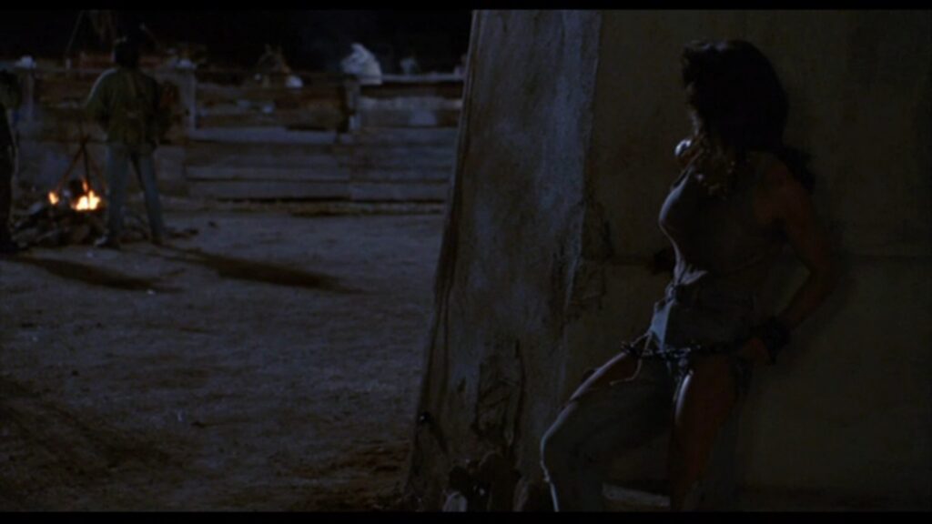 攫われたマギーは敵の隊長と思しき巨漢によって、木に後ろ手に縛り付けられていた。ここでマギーの胸をはだけさせる無駄なサービスシーン(笑)が発生しますが、こんな物を入れるくらいならマギーの衣装をショートパンツにしておいて欲しかったですね。その方が遥かに訴求力が高かったでしょうに(苦笑)