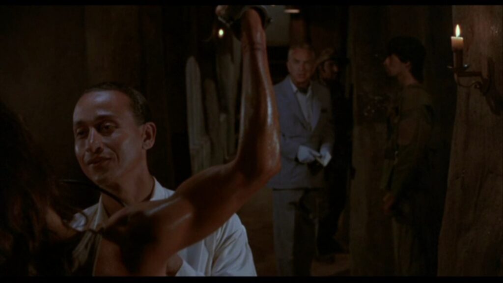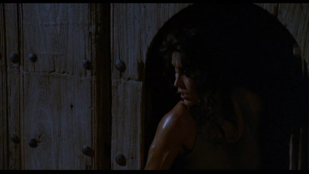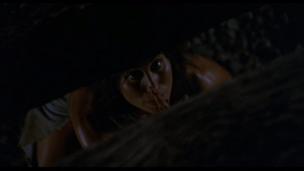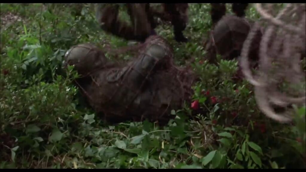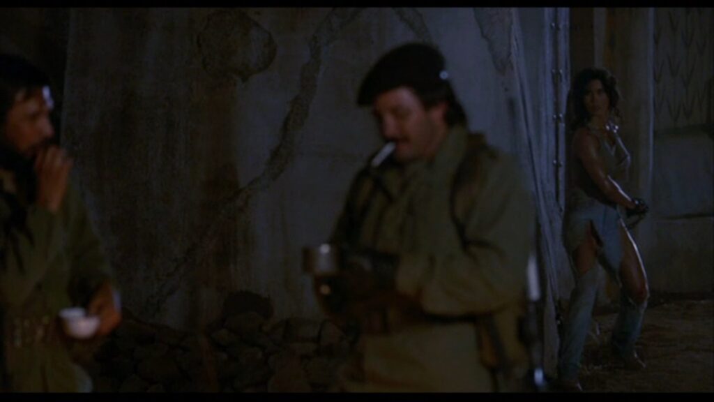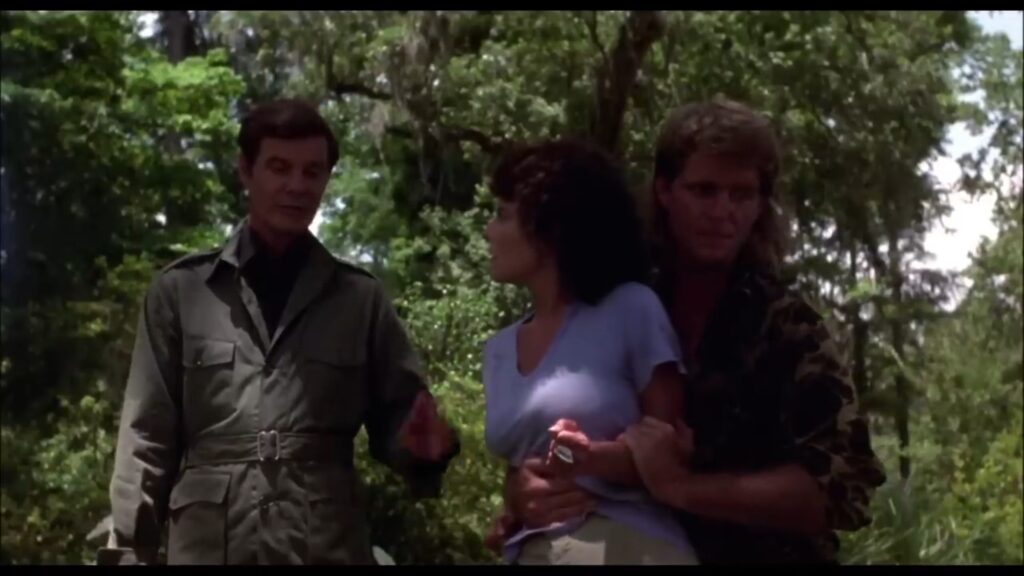 攫われたマギーは敵の隊長と思しき巨漢によって、木に後ろ手に縛り付けられていた。ここでマギーの胸をはだけさせる無駄なサービスシーン(笑)が発生しますが、こんな物を入れるくらいならマギーの衣装をショートパンツにしておいて欲しかったですね。その方が遥かに訴求力が高かったでしょうに(苦笑)